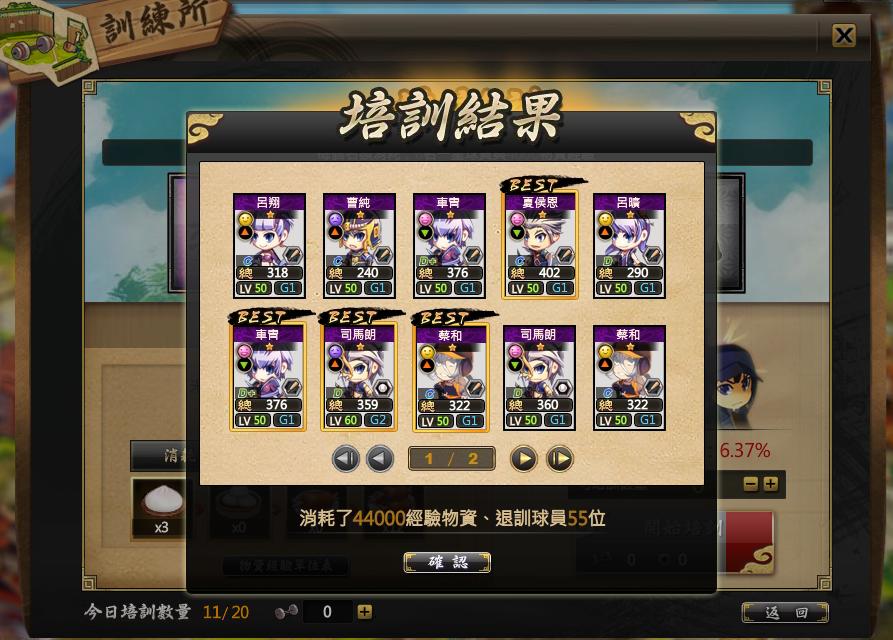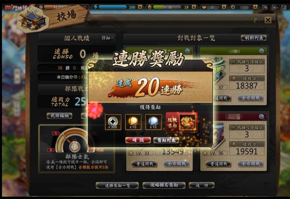 玩家可在校場與各路玩家切磋比試,連續勝利COMBO數越高,獎勵也將會更豐富!玩家可依據自己的戰力來評估對戰對象,只要部隊士氣越高昂,全隊能力就可提升2倍喔!