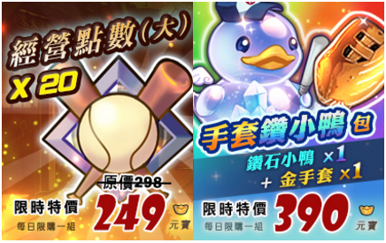 《激鬥棒球魂》感謝眾多玩家的熱情支持,官方特別推出市集限時特價活動,讓所有君主都能買到賺到,每種超值組合每日各限購1組,不要錯過特賣時間囉,要買要快!!