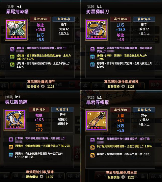 週五至週日間,球場將機率掉落「專武&強化道具」活動,讓所有玩家可以快速提昇武將各項能力,針對自身需求進攻州郡球場,若攻打成功則有低機率獲得專武的機會,交州球場 - 鳳尾荊棘帽 (龐統、糜竺),荊州球場 - 將星獨鏈刀 (夏侯惇、夏侯淵),揚州球場 - 橫江鐵鎖鍊 (甘寧、潘璋),豫州球場 - 暴君弄權棍 (董卓、徹里吉),若於此四州挑戰球場時,還有機會獲得高效率+20強化道具,且當日攻打越多次球場則獲得專武及強化道具的機率也會進而提升哦!