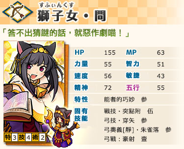 ※「獅子女・問」的外觀、各有特性/技/術及欄位都和一般的獅子女有所差異,基礎數值設定的比舶來極稀有「帕絲蒂」來的高,但加成點數上限值比較低。此外,基礎數值+加成點數的合計值略高於「帕絲蒂」。