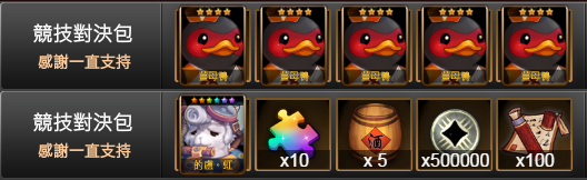 「競技對決包」內有的盧。虹x1、通用鑽碎片x10、薑母鴨x5、元氣酒(極)x5、銀兩x50萬、保證書x100