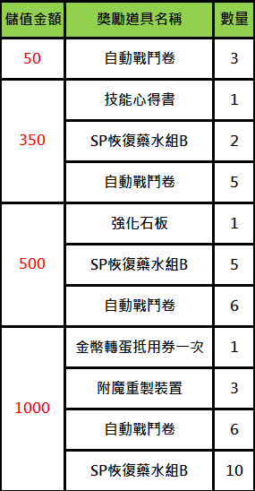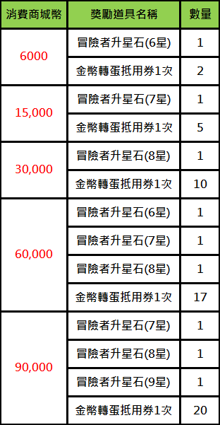 3. 如玩家於活動期間『單筆儲值金額1000,共儲值10次,並於遊戲內花了30,000商城幣』,則可於遊戲內郵件收到累積消費6,000、15,000、30,000獎勵各乙份;活動結束後還可以領到單筆儲值1000獎勵10份,依此類推。