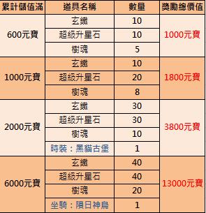 現在儲值就送玄鐵、超級升星石、樹魂、時裝《黑貓古堡》、坐騎《隕日神鳥》等各式超值好禮!