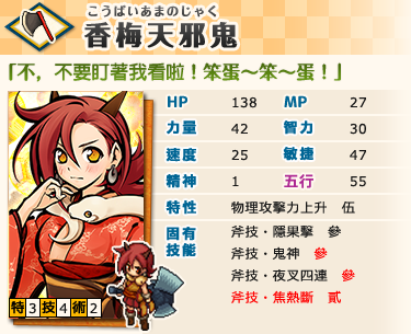 ※「香梅天邪鬼」強化到相當於稀有類式姬,與一般天邪鬼有不同的特性/技/術。