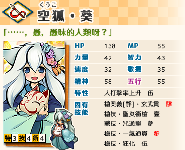 ※「空狐・葵」插圖與一般「空狐」不同,能力相當於極稀有式姬,持有特性/技/術產生變化,列入極稀有式姬類別內。
